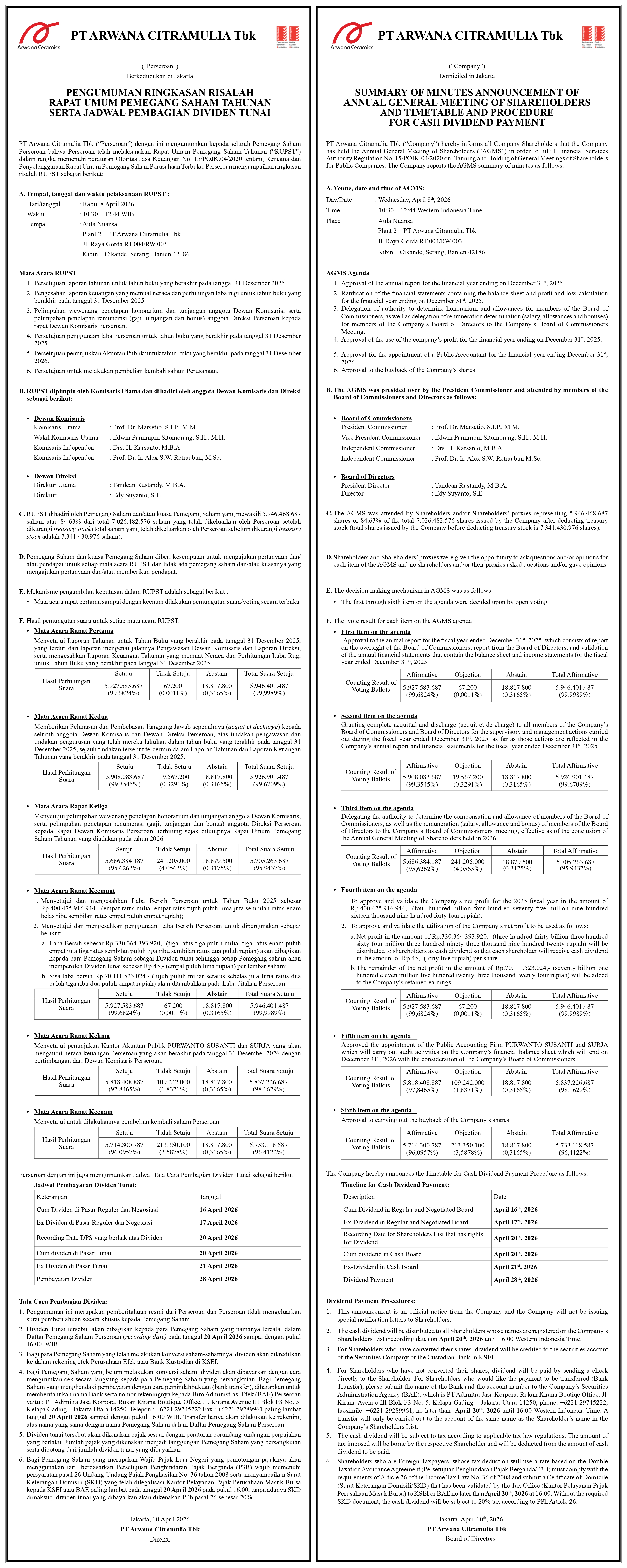 On April 8, 2026, we held our 2025 Annual General Meeting of Shareholders at Plant II, Serang, Banten, with all six voting agendas approved by the forum. The resolutions of